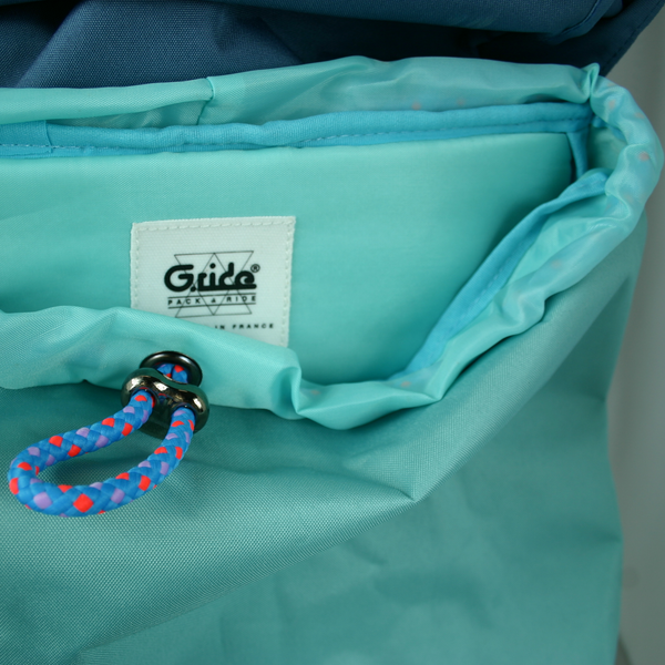 開口部はマウンテンロープの締め、フラップには1か所のファスナー付外部ポケットがあります。